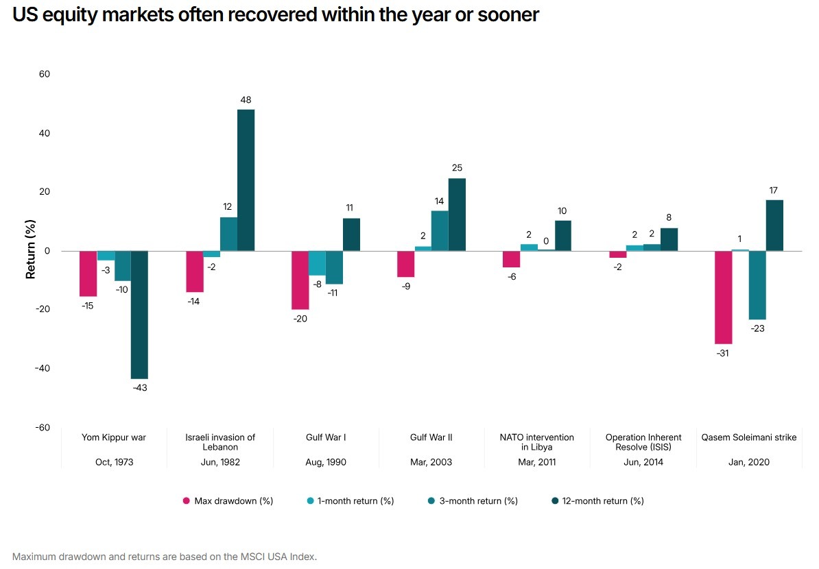 History shows that geopolitical shocks often produce sharp short-term market reactions, but limited long-term deterioration in broad equity indices absent a major economic downturn: